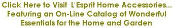 We now offer an On Line Photo Catalog containing photographs with descriptions and prices of our antiques and home accessories available at L'Esprit, including Country French armoires, tables, chairs, garden furniture, architectural and ironwork and much, much more. We also offer new home accessories including table linens, lighting, glassware, bath accessories and luxurious French soaps, baskets and ironwork.